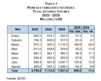 Santo Domingo, RD. El Banco Central de la República Dominicana (BCRD) informa que, entre enero y agosto de 2025, las remesas recibidas alcanzaron la cifra de US$7,921.0 millones, aumentando US$808.5 millones (11.4 %) en comparación con el mismo período del año anterior. Particularmente, en el mes de agosto se recibieron US$1,046.5 millones, un incremento de US$94.2 (9.9 %) respecto a agosto de 2024. En lo que va del año 2025, agosto es el tercer mes en el cual las remesas recibidas superan los US$1,000 millones, junto con marzo y julio. Cabe destacar que, estos recursos suministrados por la diáspora dominicana en el exterior tienen un efecto multiplicador sobre el consumo, la inversión y el financiamiento de los sectores más vulnerables del país.