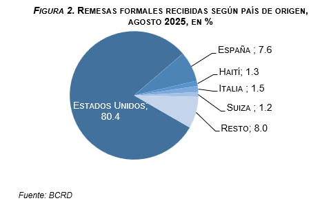 El BCRD explica que el desempeño económico de los Estados Unidos fue uno de los principales factores que incidió sobre el comportamiento de las remesas, ya que desde ese país se originó el 80.4 % de los flujos formales del mes de agosto, unos US$751.2 millones. Asimismo, el desempleo general del país norteamericano se ubicó en 4.3 % en agosto, un ligero aumento respecto al nivel de 4.2 % del pasado mes de julio de 2025, con la adición de 22,000 nuevos empleos.