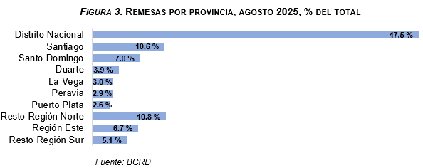 Respecto a la distribución de las remesas recibidas por provincias, el BCRD señala que el Distrito Nacional recibió una proporción del 47.5 % durante agosto, seguido por las provincias de Santiago y Santo Domingo, con un 10.6 % y 7.0 %, respectivamente. Esto indica que cerca de dos terceras partes de las remesas (65.0 %) se recibe en las zonas metropolitanas del país.