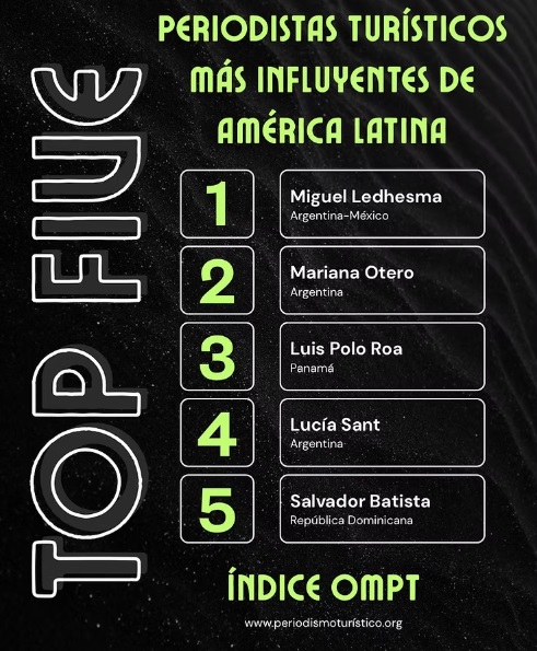 Batista, con una puntuación de 74, se consolidó como el único representante de la República Dominicana en este selecto grupo, reafirmando su trayectoria y su impacto en la forma de comunicar el turismo en la región. El ranking fue encabezado por el argentino radicado en México Miguel Ledhesma, seguido por Mariana Otero, de Argentina; Luis Polo Roa, de Panamá; y Lucía Sant, de Argentina.